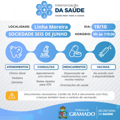 A comunidade da Linha Moreira e arredores está convidada a participar de mais uma edição da Interiorização da Saúde, realizada pela Administração Municipal, por meio da Secretaria da Saúde. A ação acontece no sábado (19), das 9h às 11h30, na Sociedade Seis de Junho. Será oferecido atendimento com clínico geral, pediatra e dentista.
