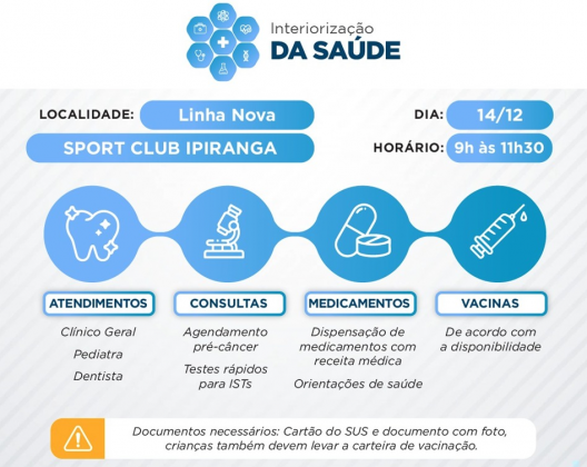 No próximo sábado (14), das 9h às 11h30, a comunidade da Linha Nova receberá os serviços de saúde do município em mais uma ação de Interiorização. A iniciativa busca aproximar serviços de saúde da população local, promovendo acesso facilitado e orientações essenciais.