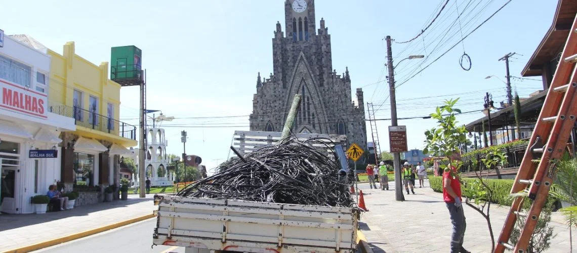 Durante a manhã desta terça-feira, dia 25, a Prefeitura de Canela, através da Secretaria Municipal de Trânsito e Fiscalização, em parceria com a RGE e operadoras de internet da região, realizaram a primeira etapa da Operação Poste Limpo, onde foi efetuada a retirada de 1,5 tonelada de cabos inativos dos postes do centro da cidade.
