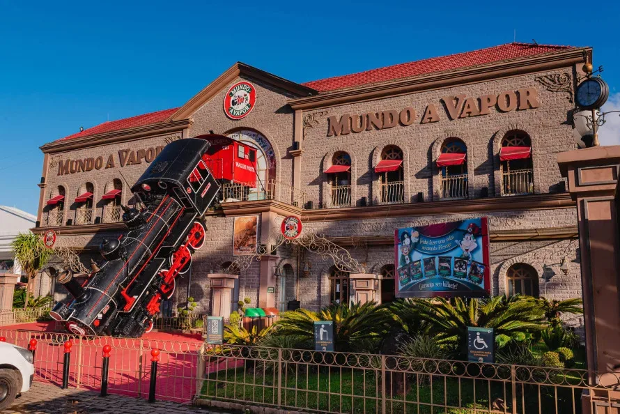 Inaugurado em 1991, o Mundo a Vapor proporciona aos visitantes uma verdadeira viagem no tempo. O parque foi fundado pelos Irmãos Urbani, que herdaram do pai a paixão por máquinas a vapor. No local é feito uma volta ao mundo, contada através das invenções dos fundadores, que são únicas. Além disso, há cenários instagramáveis, diversão garantida com o passeio de trem, photo antiga, espaço kids, café e outras atrações. A famosa fachada do parque, que será reformulada, representa um acidente real que ocorreu no dia 22 de outubro de 1895, em Paris, quando uma locomotiva atravessou o saguão da estação ferroviária de Montparnasse, transpôs a sacada e despencou de uma altura de dez metros. A réplica do trem pendurado, uma das imagens mais conhecidas pelos turistas na Serra Gaúcha, será mantida nesta revitalização. No segundo trimestre de 2024, o Mundo a Vapor vai inaugurar a Roda Canela, a primeira roda-gigante temática do mundo, com quase 60 metros de altura, 30 cabines e vista de 360 graus.