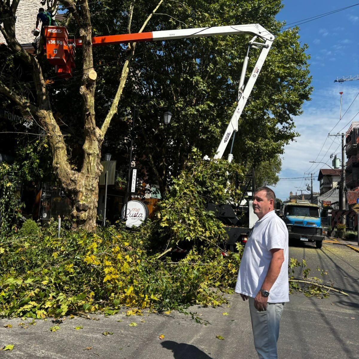 O vereador Nene Abreu esteve na Avenida Osvaldo Aranha, uma das principais vias de Canela, acompanhando e fiscalizando o trabalho de poda das árvores realizado no local. A ação tem como objetivo melhorar a visibilidade, a segurança e também contribuir para a valorização do comércio da região.
