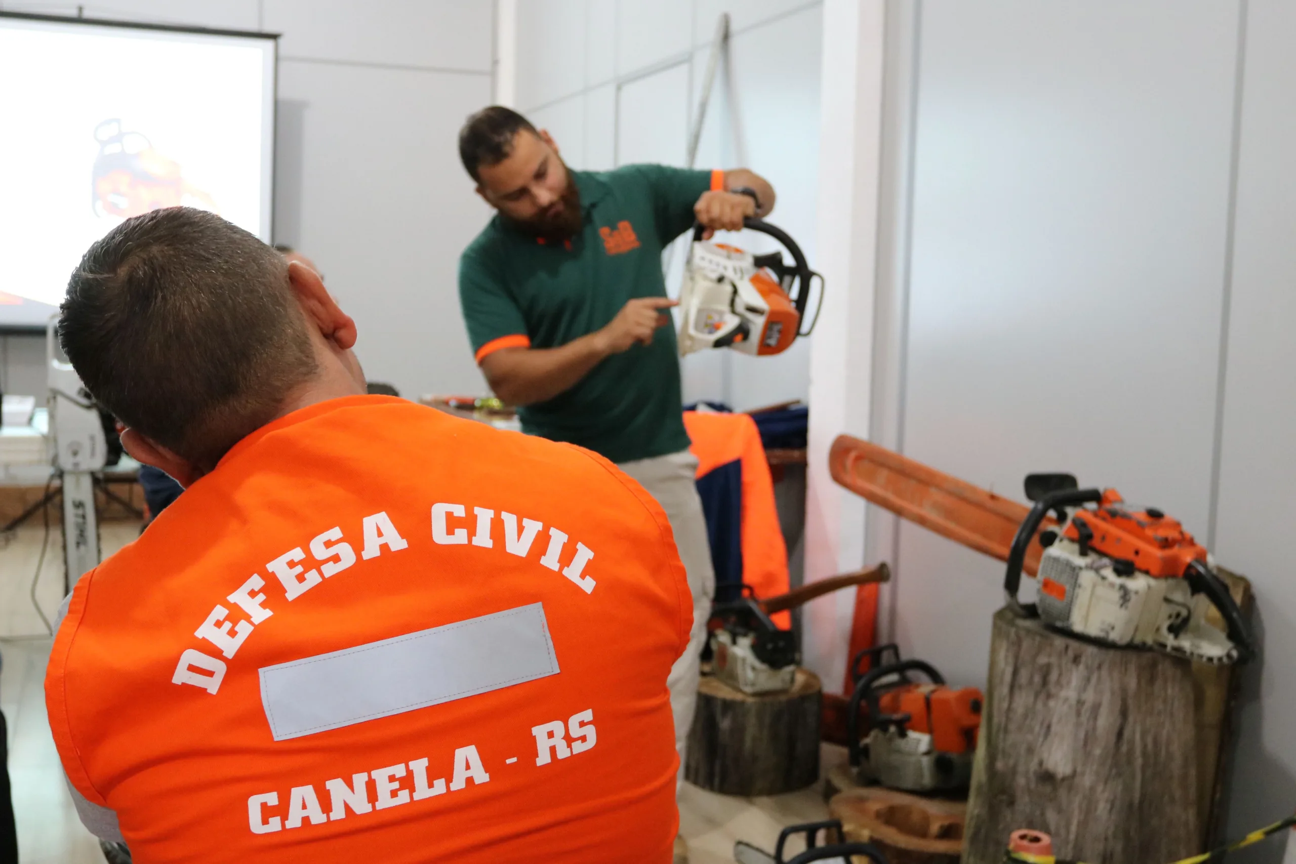 A Prefeitura Municipal iniciou na última semana a qualificação dos membros da nova Defesa Civil de Canela. As formações vão acontecer em ciclos e são oferecidas por meio de parceria entre as Secretarias de Trânsito e Fiscalização e de Governo. O primeiro encontro ocorreu na quarta-feira, dia 9, na sede da Defesa Civil, e abordou a Norma Regulamentadora 12 (NR-12), que trata do uso seguro de motosserra.