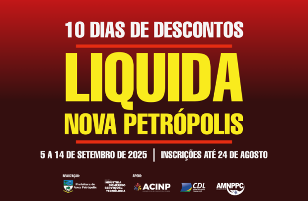 A Campanha “Liquida Nova Petrópolis – 10 Dias de Descontos” é uma realização da Prefeitura de Nova Petrópolis, por meio da Secretaria Municipal de Indústria, Comércio, Serviços e Tecnologia, e conta com o apoio da Associação Comercial e Industrial de Nova Petrópolis (ACINP), da Câmara de Dirigentes Lojistas de Nova Petrópolis e Picada Café (CDL) e da Associação de Malharias de Nova Petrópolis e Picada Café (AMNPPC).