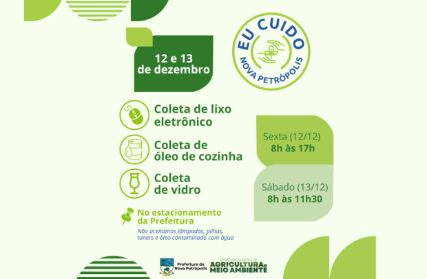 A Prefeitura de Nova Petrópolis realizará a 4ª Coleta de Lixo Eletrônico, Óleo de Cozinha e Vidro nos dias 12 e 13 de dezembro, sexta e sábado. A ação ambiental é promovida pela Secretaria Municipal de Agricultura e Meio Ambiente, e acontecerá no estacionamento da Prefeitura. Na sexta-feira, a coleta ocorre das 8h às 17h, e no sábado, das 8h às 11h30.