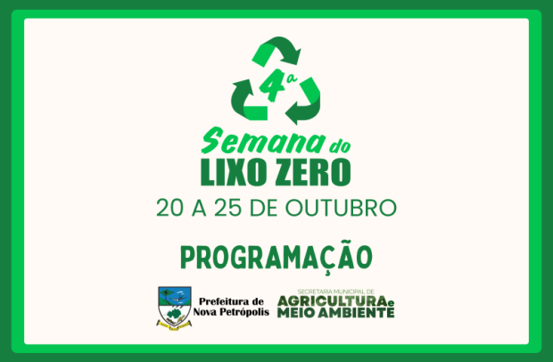 Durante os dias 20 e 25 de outubro, a Prefeitura de Nova Petrópolis, por meio da Secretaria Municipal de Agricultura e Meio Ambiente, promove a 4ª Semana do Lixo Zero, uma iniciativa de caráter ambiental que visa incentivar a reflexão da população sobre a geração e destinação correta do lixo. A iniciativa contará com programações nas escolas do Município e para a população em geral.