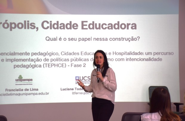O momento trouxe a sensibilização como fase da pesquisa “Turismo essencialmente pedagógico, Cidades Educadoras e Hospitalidade”, coordenada pelas professoras Drª. Francielle de Lima (UNIPAMPA) e Drª. Luciane Todeschini Ferreira (UCS). O ciclo de palestras foi organizado para contemplar diferentes públicos, na tarde de 2 de outubro participaram autoridades e diretores das escolas municipais, na noite de 2 de outubro o encontro recebeu a comunidade em geral e na manhã do dia 3 de outubro foi a vez dos supervisores escolares da rede municipal.