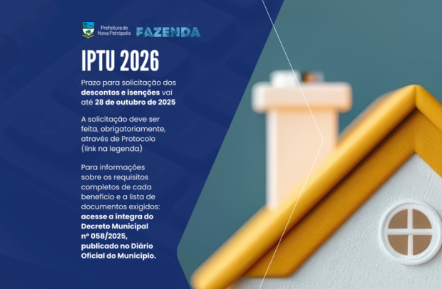 A Prefeitura de Nova Petrópolis, por meio da Secretaria Municipal da Fazenda, informa que foi publicado o Decreto Municipal nº 058, de 2 de maio de 2025, que regulamenta os artigos 17 a 22 da Lei Municipal nº 5.040/2021, que institui o Código Tributário Municipal. O decreto estabelece as normas e prazos para a concessão de descontos e isenções do Imposto Predial e Territorial Urbano (IPTU) para o exercício de 2026.