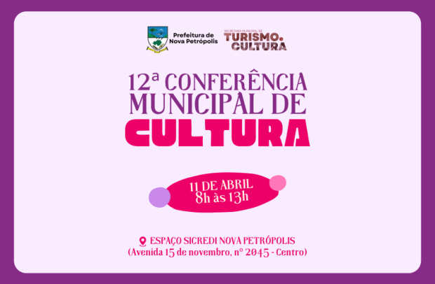 A Prefeitura de Nova Petrópolis, por meio do Conselho Municipal de Políticas Públicas Culturais e da Secretaria Municipal de Turismo e Cultura, realizará, no dia 11 de abril, a 12ª Conferência Municipal de Cultura, que tem como objetivo discutir, propor e fortalecer as políticas culturais do Município. Com o tema “Para onde a Cultura de Nova Petrópolis está caminhando”, o encontro ocorre das 8h às 13h, no auditório do Espaço Sicredi de Nova Petrópolis, localizado na Avenida 15 de Novembro, nº 2045, Centro. A atividade é aberta ao público, voltada a agentes culturais e representantes de entidades, como grupos de danças, coros, orquestras, sociedades e associações do Município. Entidades e pessoas com cadastro de agente cultural podem se inscrever previamente através do link https://forms.gle/oAgtLK3QEURV5XGXA a partir do dia 6 de abril.