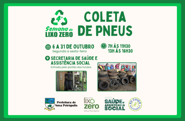 A Prefeitura de Nova Petrópolis, através da Secretaria Municipal de Saúde e Assistência Social, realizará a Coleta Especial de Pneus Inservíveis de 6 a 31 de outubro. Os moradores de Nova Petrópolis que possuem pneus inutilizados em suas residências podem se dirigir ao portão dos fundos da sede da Secretaria Municipal de Saúde e Assistência Social. O local tem acesso pela Rua João Leão, junto ao cruzamento com a Rua Rui Barbosa. O recolhimento acontecerá das 7h às 11h30 e das 13h às 16h30, de segunda a sexta-feira.