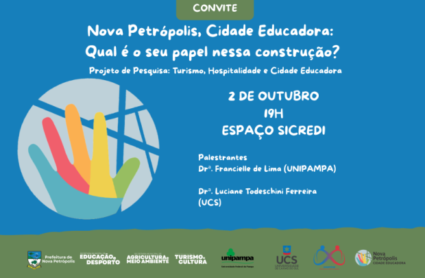 Nos dias 2 e 3 de outubro, o Espaço Sicredi em Nova Petrópolis será o ponto de encontro para uma série de palestras que visam aprofundar o debate sobre os conceitos de Cidades Educadoras e Turismo Pedagógico. Os eventos são uma iniciativa da pesquisa “Turismo essencialmente pedagógico, Cidades Educadoras e Hospitalidade”, coordenada pelas professoras Drª. Francielle de Lima (UNIPAMPA) e Drª. Luciane Todeschini Ferreira (UCS).
