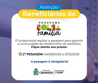 A Secretaria da Saúde de Gramado informa que o período correto para a 2ª Pesagem do Programa Bolsa Família 2025 ocorre de 4/8/2025 a 31/12/2025. A pesagem deve ser realizada na Unidade de Saúde Referência do beneficiário, sendo obrigatória para crianças menores de 7 anos, mulheres com idade entre 14 e 44 anos e gestantes.