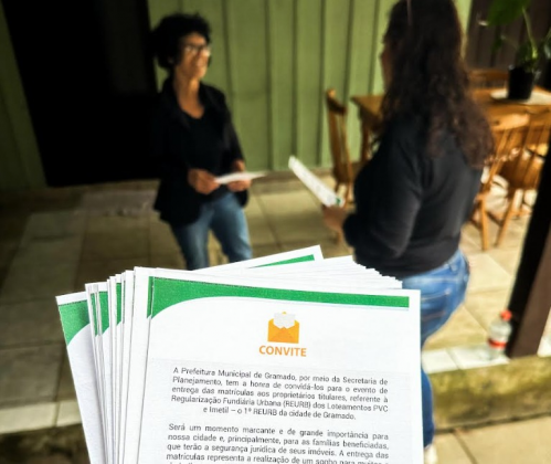A Administração Municipal de Gramado, representada pela servidora da Secretaria de Planejamento, Mariana Berti e pela servidora da Secretaria da Cidadania e Assistência Social, Roberta Rama, realizou nesta segunda-feira (7), a entrega presencial dos convites aos moradores dos Loteamentos PVC e Imetil, para a solenidade de posse das matrículas dos terrenos, que acontecerá no próximo dia 15 de abril (terça-feira), a partir das 18 horas, na Sociedade São Luiz, na Várzea Grande.