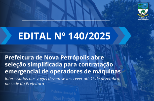 A Prefeitura de Nova Petrópolis abriu inscrições para seleção simplificada para contratações de pessoal em caráter emergencial e por tempo determinado. As vagas são destinadas a dois operadores de máquinas para a Secretaria Municipal de Obras e Serviços Públicos. Interessados devem se inscrever até 1º de dezembro, das 8h30 às 11h30 e das 13h30 às 16h30, presencialmente, junto ao Protocolo da Prefeitura Municipal, localizada na Rua Sete de Setembro, nº 330, 2º andar, Centro, conforme previsto no Edital 140/2025. Não serão aceitas inscrições fora do prazo.