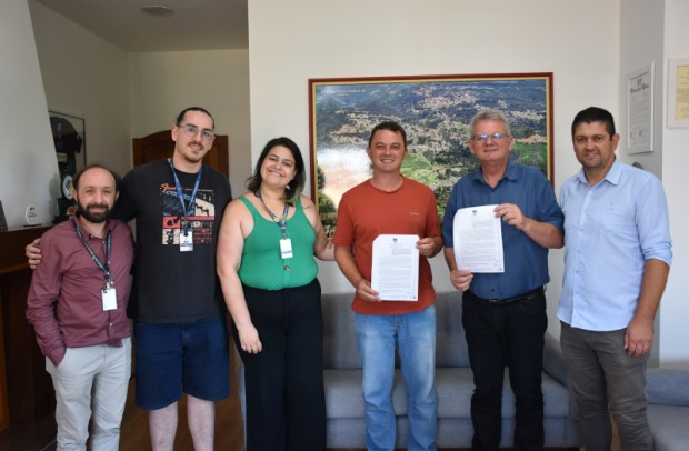 O vice-prefeito de Nova Petrópolis, Alexandre da Silva; o secretário Municipal de Turismo e Cultura, Rodrigo Barbieri Sangali, a diretora do Departamento Municipal de Cultura, Iasmin Schmitt; e o diretor do Arquivo e Patrimônio Histórico de Nova Petrópolis, Pedro Henrique Scheer, participaram do ato de assinatura do documento.
