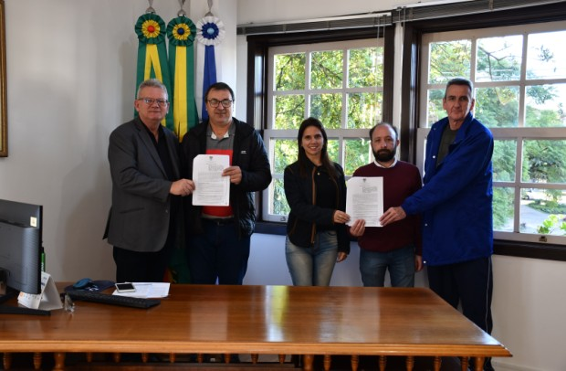 O Poder Público Municipal e o Sindicato dos Trabalhadores Agricultores Familiares de Nova Petrópolis e Picada Café firmaram termo de fomento nesta quarta-feira, 14 de maio, no Gabinete Oficial. O prefeito de Nova Petrópolis, Daniel Carlos Michaelsen, e o presidente do Sindicato, Ari Arsênio Boelter, assinaram o Termo de Fomento nº 059/2025, que prevê o repasse financeiro de R$ 400 mil pelo Executivo Municipal para a realização do Festival Sabores da Colônia 2025. A secretária Municipal de Agricultura e Meio Ambiente, Denise Maltoni Bino; o secretário Municipal de Turismo e Cultura, Rodrigo Barbieri Sangali; e o diretor do Departamento de Atividades de Educação Desportiva, Luiz André Port, também participaram do ato de assinatura do documento.