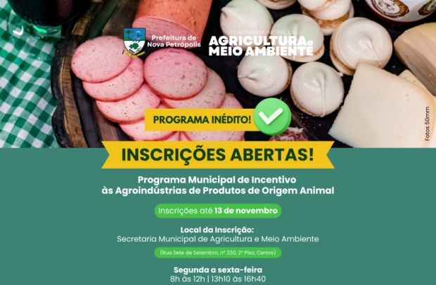 A Prefeitura de Nova Petrópolis, por meio da Secretaria Municipal de Agricultura e Meio Ambiente, abriu inscrições para o Programa Municipal de Incentivo às Agroindústrias de Produtos de Origem Animal, uma iniciativa inédita no Município, voltada ao fortalecimento e à qualificação das agroindústrias familiares registradas no Serviço de Inspeção Municipal (SIM). O programa foi instituído pela Lei Municipal nº 5.590/2025 e regulamentado pelo Decreto nº 015/2026, e tem como objetivo fomentar o desenvolvimento das agroindústrias, garantindo melhores condições de produção, adequação às exigências sanitárias e agregação de valor aos produtos de origem animal.