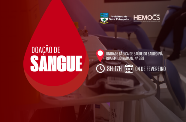A coleta de sangue em Nova Petrópolis, promovida pelo Hemocentro Regional de Caxias do Sul (HEMOCS), em parceria com o Município, ocorre no dia 4 de fevereiro, quarta-feira, das 8h às 17h, na Unidade Básica de Saúde (UBS) do Bairro Piá, na Rua Emílio Raimann, n° 588. Doadores interessados em participar podem realizar agendamento com a Secretaria Municipal de Saúde e Assistência Social pelo telefone (54) 3298-2650, ou com a sua UBS de referência. Todas as doações são destinadas ao Hemocentro.