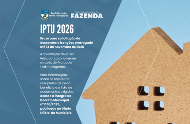 A Prefeitura de Nova Petrópolis, por meio da Secretaria Municipal da Fazenda, informa que o prazo para solicitação dos descontos e isenções do Imposto Predial e Territorial Urbano (IPTU) para o exercício de 2026 foi prorrogado até o dia 14 de novembro de 2025. A medida tem como objetivo oferecer mais tempo para que os contribuintes reúnam a documentação necessária e realizem o protocolo do pedido. O Decreto nº 058/2025 detalha os critérios e a documentação necessária para que os munícipes possam solicitar diversos benefícios fiscais. A solicitação deve ser feita obrigatoriamente através de Protocolo, sendo o meio online o preferencial (https://novapetropolis.1doc.com.br/b.php?pg=wp/wp&itd=5).
