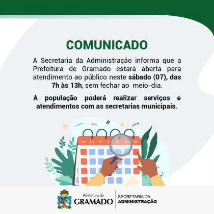 A Secretaria da Administração informa que a Prefeitura de Gramado estará aberta para atendimento ao público neste sábado (07), das 7h às 13h, sem fechar ao meio-dia. A população poderá realizar serviços e atendimentos com as secretarias municipais.