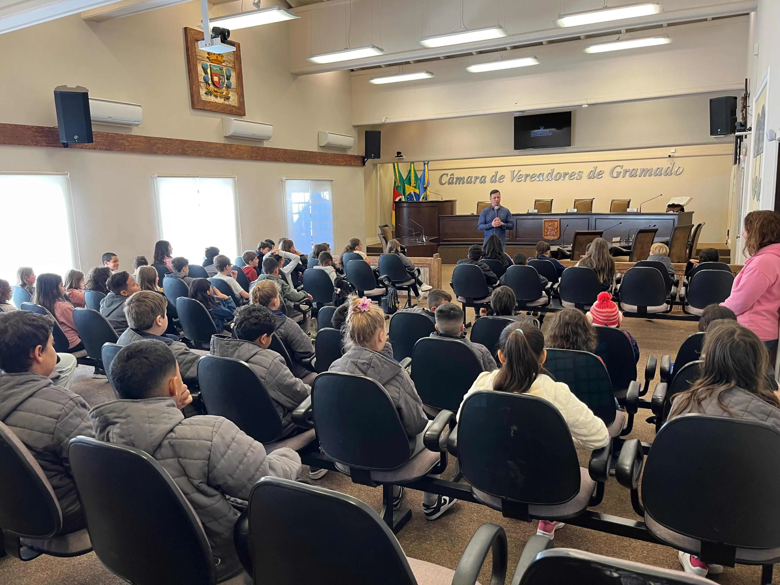 O projeto Plantando o Futuro, da Escola do Legislativo Ivo Bezzi, segue aproximando escolas da Câmara de Gramado. Na manhã desta segunda-feira, dia 5, o diretor da Escola do Legislativo, Fábio Schmatz, recebeu cerca de 60 estudantes do 4º ano da Escola Municipal Senador Salgado Filho para mais uma visita especial à Casa do Povo.