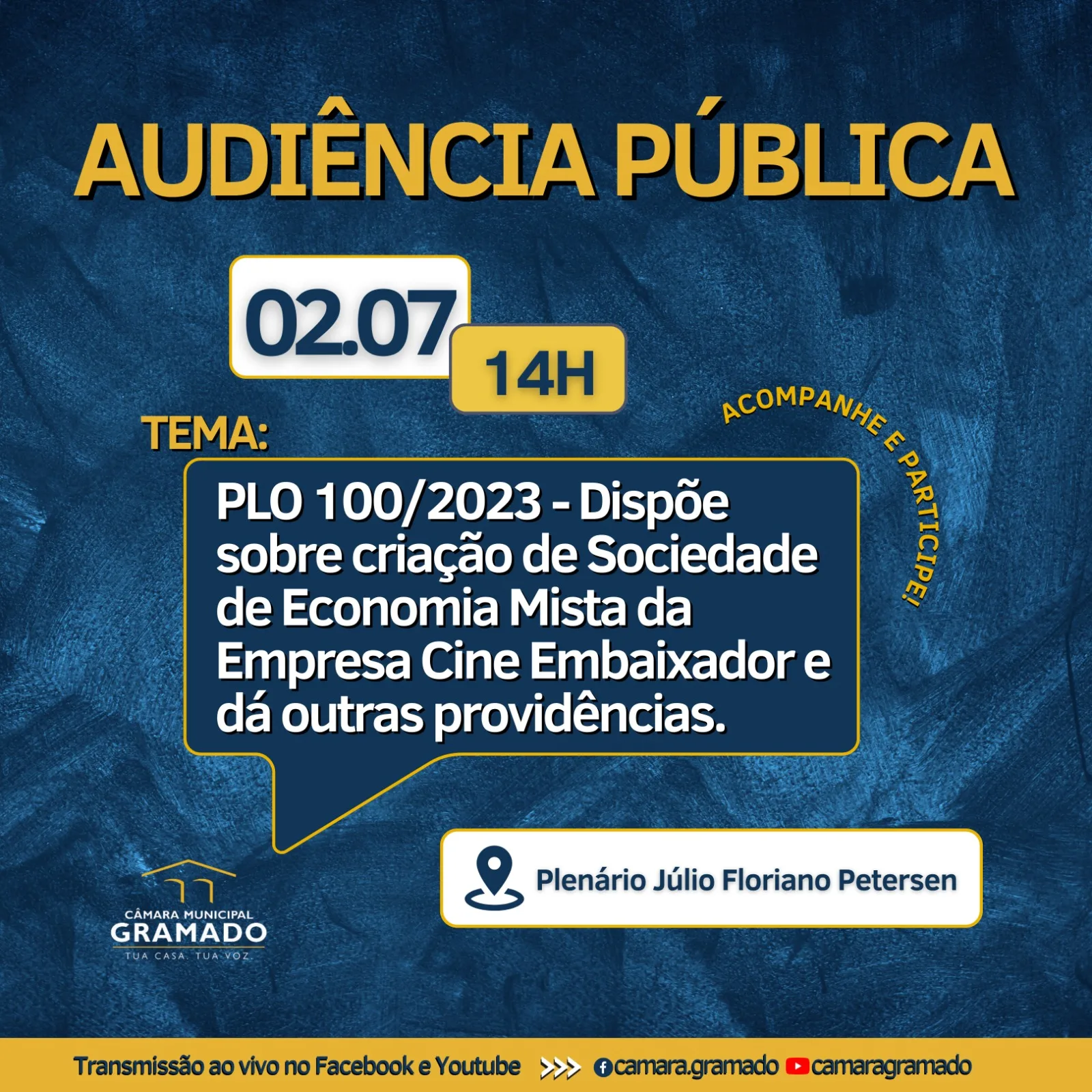 Home NotíciasCâmara Municipal de GramadoProposta de Sociedade de Economia Mista do Cine Embaixador será discutida em audiência pública