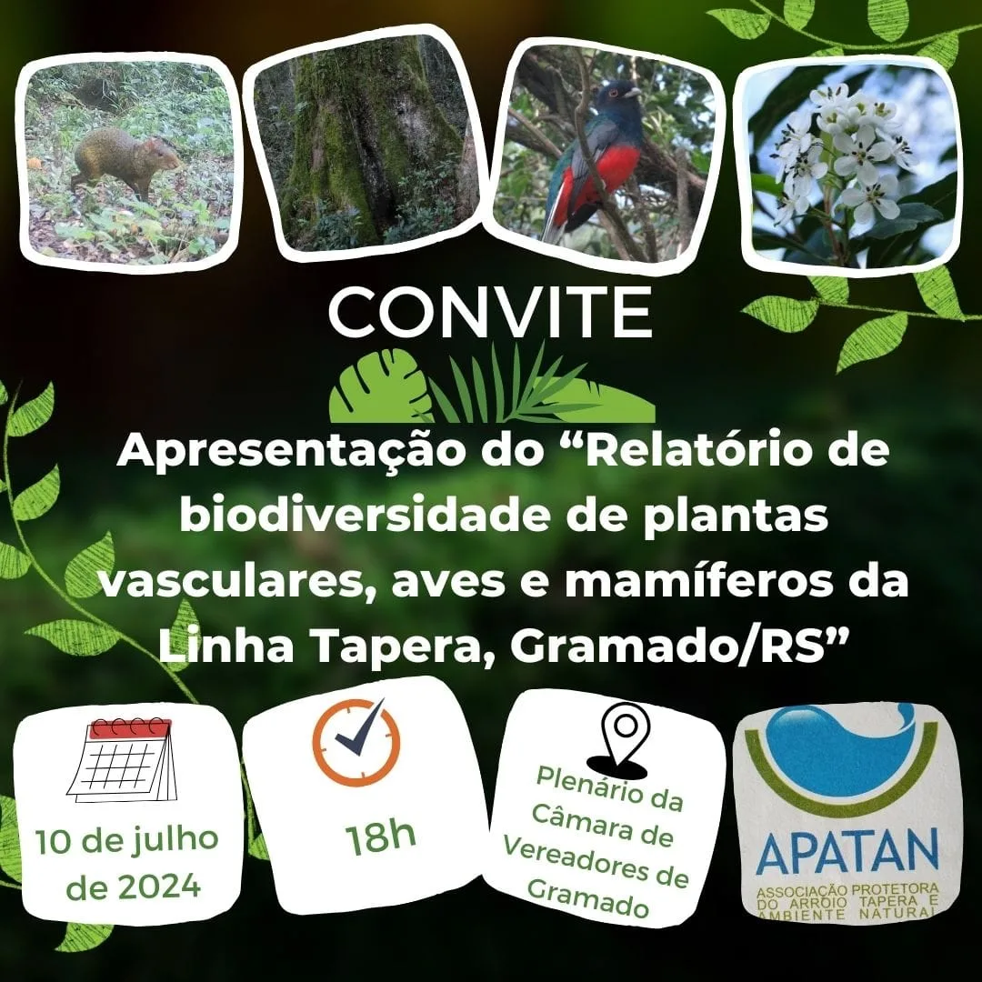 A Câmara de Vereadores de Gramado irá sediar no próximo dia 10 de julho, um evento realizado pela Associação Protetora do Arroio Tapera e Ambiente Natural (Apatan). Na ocasião, será apresentado o relatório de biodiversidade de plantas vasculares, aves e mamíferos da Linha Tapera, em Gramado.