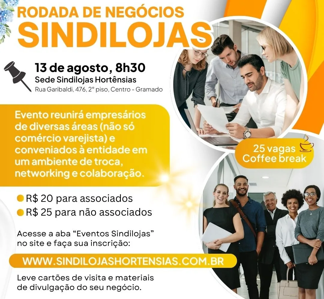 Na manhã do dia 13 de agosto, o Sindilojas Região das Hortênsias promoverá uma Rodada de Negócios, evento pensado para incentivar conexões estratégicas e o crescimento coletivo do varejo regional. Com início às 8h30, a atividade será realizada na sede da entidade (Rua Garibaldi, 476, 2° piso – Gramado) e reunirá empresários de diversas áreas (não só comércio varejista) e conveniados à entidade em um ambiente de troca, networking e colaboração.