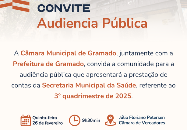 A Câmara Municipal de Gramado promove nesta quinta-feira (26), às 9h30min, uma Audiência Pública para apresentação da prestação de contas da Secretaria Municipal da Saúde.