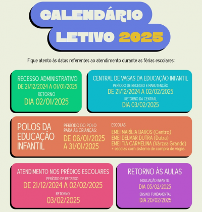 O atendimento dos polos da Educação Infantil iniciam a partir de 06 de janeiro de 2025. Estes atendimentos serão realizados para as famílias que sinalizaram previamente a necessidade do atendimento escolar durante o período do recesso escolar do município. Neste ano, a EMEI Marília Daros, EMEI Delmar Dutra e EMEI Tia Carmelina estarão abertas para receber estes alunos. O atendimento dos polos acontecerá até o dia 31 de janeiro.