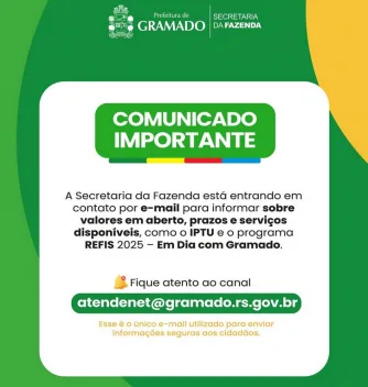 A Administração Municipal de Gramado, por meio da Secretaria da Fazenda, está colocando em prática mais um canal de comunicação com os contribuintes. Com o objetivo de informar os cidadãos gramadenses em relação a valores que estão em aberto com o município, tanto de IPTU como do Programa de Recuperação Fiscal ‘Em Dia com Gramado’ – REFIS 2025, a gestão municipal está fazendo contato pelo e-mail oficial [email protected] .