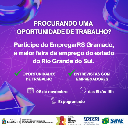 A Prefeitura de Gramado, por meio da Secretaria de Inovação e da Fundação Gaúcha do Trabalho e Ação Social, realizará no dia 8 de novembro, sexta-feira, a 9ª edição do EmpregarRS — a maior feira de empregos do estado. O evento já beneficiou mais de 130 mil trabalhadores gaúchos, com o objetivo de aproximar empregadores e candidatos em um único espaço para a realização de entrevistas de emprego.