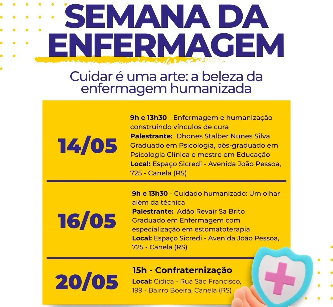 Visando debater o olhar humanizado na enfermagem, a Prefeitura de Canela, através da Secretaria Municipal de Saúde, realizará a Semana da Enfermagem com atividades nos dias 14, 16 e 20 de maio. As palestras dos dias 14 e 16 acontecerão no Espaço Sicredi, localizado na Avenida João Pessoa, 725.