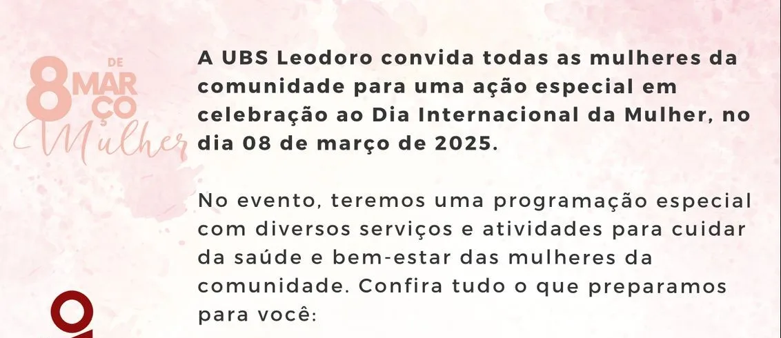 A Prefeitura de Canela, por meio da Secretaria de Saúde, realizará uma ação especial em celebração ao Dia Internacional da Mulher, neste sábado, dia 8, das 8 às 11 horas, na Unidade de Saúde do bairro Leodoro Azevedo. O evento será aberto à comunidade e contará com uma programação especial com diversos serviços e atividades para cuidar da saúde e bem-estar do público feminino.