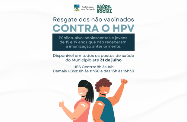 A Prefeitura de Nova Petrópolis, por meio da Secretaria Municipal de Saúde e Assistência Social, informa que adolescentes e jovens entre 15 e 19 anos que ainda não se vacinaram contra o HPV terão uma nova oportunidade para se proteger. A imunização está disponível gratuitamente em todas as Unidades Básicas de Saúde (UBSs) de Nova Petrópolis, até 31 de julho, de segunda a sexta-feira. O público-alvo poderá se vacinar na UBS Centro, das 8h às 16h, e nas demais UBSs, das 8h às 11h30 e das 13h às 16h30. A vacina também será ofertada no dia 10 de maio, próximo sábado, das 8h às 17h, em todas as UBSs do Município.