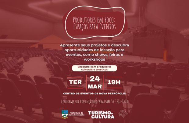A Secretaria de Turismo e Cultura de Nova Petrópolis promove, no dia 24 de março, às 19h, um encontro com produtores culturais no Centro de Eventos do Município, com o objetivo de apresentar a estrutura do espaço e abrir novas oportunidades para a realização de espetáculos e eventos artísticos no Município. Os interessados devem confirmar presença pelo WhatsApp (54) 3281-8403 até o dia 23 de março.