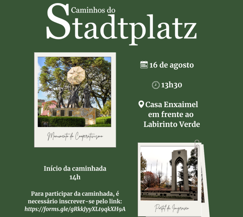 A Prefeitura de Nova Petrópolis, através da Secretaria de Turismo e Cultura, lançará, no dia 16 de agosto, um novo roteiro de caminhadas denominado “Caminhos do Stadtplatz”. Este roteiro é uma caminhada histórica autoguiada pelo Centro de Nova Petrópolis, com cerca de dois quilômetros de extensão e duração média de uma hora. O lançamento será às 13h30, na Casa Enxaimel em frente ao Labirinto Verde, na Praça das Flores.