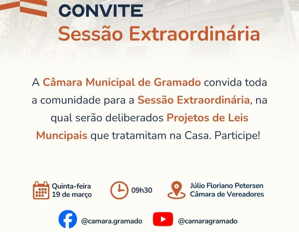 A Câmara Municipal de Gramado realizará, nesta quinta-feira (19), a sua segunda sessão extraordinária do ano, com a apreciação de matérias que estão em tramitação no Legislativo.