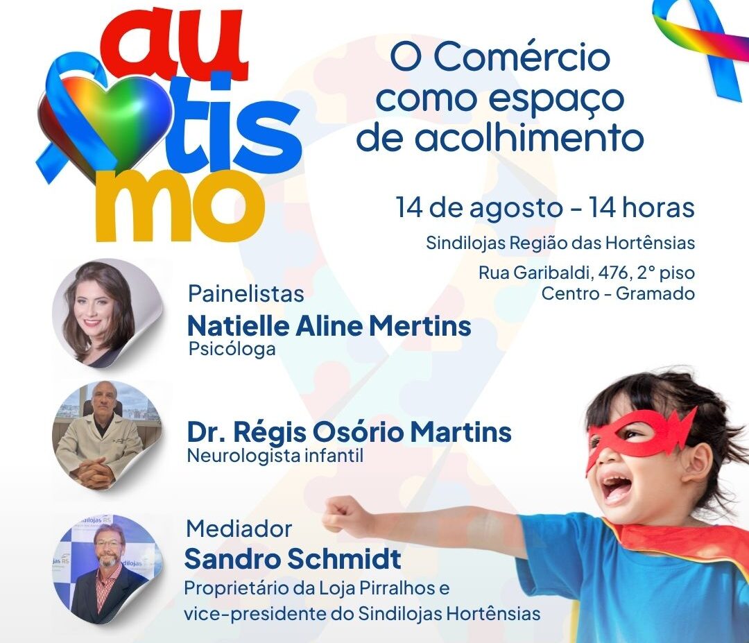 No dia 14 de agosto, às 14 horas, na sede do Sindicato Empresarial (Rua Garibaldi, 476, 2° piso, Centro de Gramado) acontecerá a palestra “Autismo – o comércio como espaço de acolhimento”, que trará dois convidados que debaterão o tema: o que é o autismo, características do TEA, desafios, inclusão e acolhimento com o objetivo de conscientizar/orientar empresários e equipes do comércio de bens, serviços e turismo no atendimento às famílias atípicas.