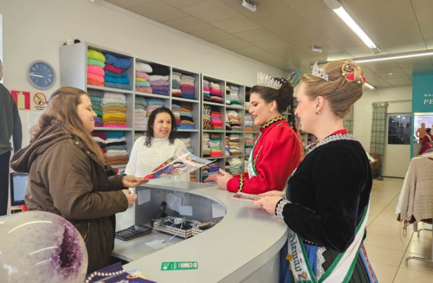 As Soberanas do Folclore Alemão, Rainha Francieli Herrmann e 1ª Princesa Cristina Kuhn, acompanhadas de uma comitiva, visitaram o comércio de Nova Petrópolis na manhã de sábado, dia 12, para divulgar a 52ª edição do Festival Internacional de Folclore. Ao som de uma bandinha típica que animou a Avenida 15 de Novembro, a corte distribuiu folders e cartazes do evento, além de convidar os comerciantes a enfeitarem suas lojas para o Festival. Além da Corte, participaram da ação o secretário de Turismo e Cultura, Rodrigo Sangali; o vice-prefeito Alexandre da Silva; Iasmin Schmitt e Eduarda Papke, do Departamento Municipal de Cultura, e dançarinos de grupos locais.