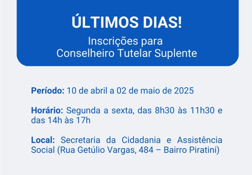 O Conselho Municipal dos Direitos da Criança e do Adolescente – COMDICA, de Gramado, lembra que as inscrições para o processo de escolha de Conselheiros Tutelares Suplentes estão nos últimos dias. O prazo se encerra nesta sexta-feira (02). A eleição será realizada no dia 24 de agosto de 2025, das 8h às 17h, em locais definidos e divulgados com pelo menos 30 dias de antecedência. O processo será conduzido pelo COMDICA e fiscalizado pelo Ministério Público, com o objetivo de eleger cinco suplentes para atuar em substituição aos conselheiros titulares quando necessário.
