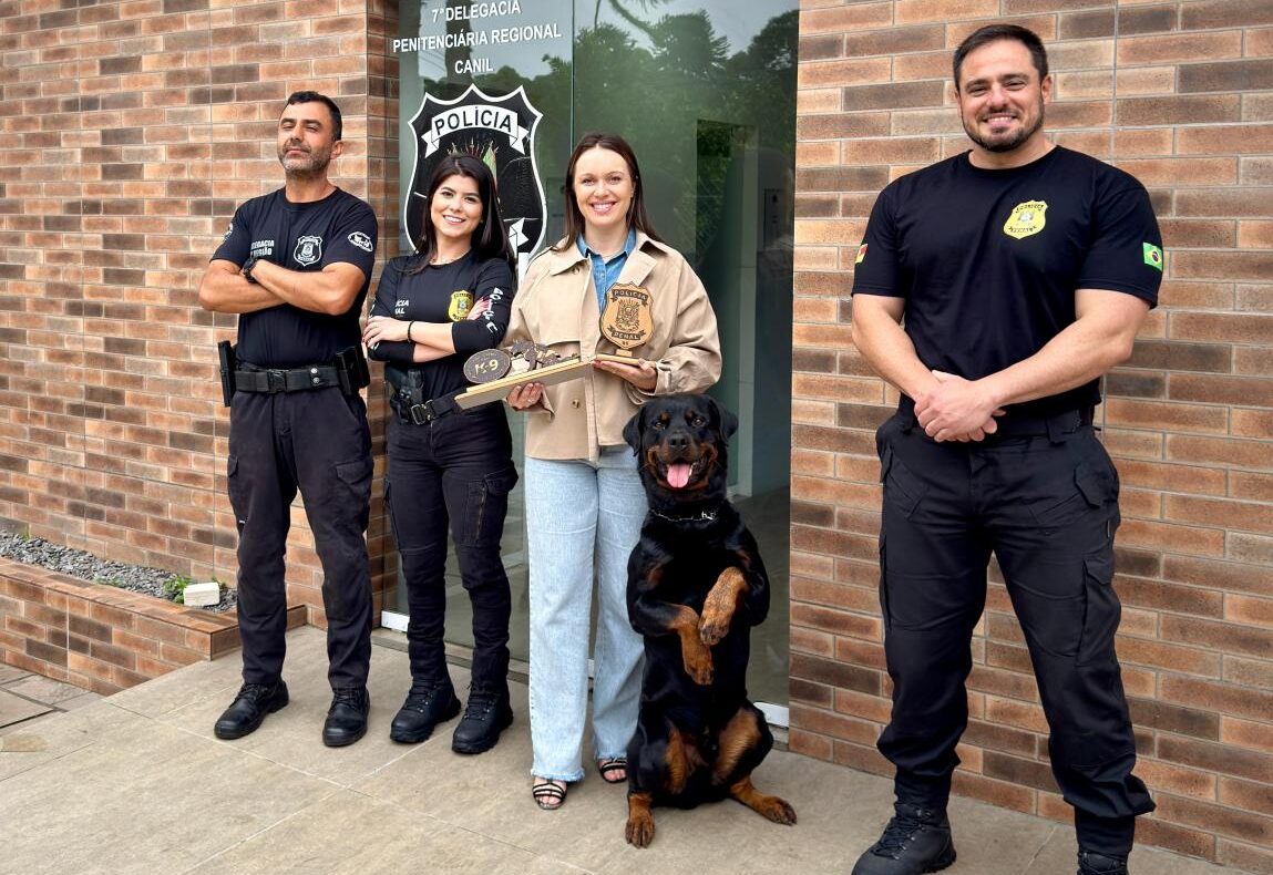 Na foto registrada durante a visita estão: Rômulo Tomazini dos Santos, administrador prisional; Lara Flores, administradora substituta; e Juliano Sousa, operador do Canil da 7ª Região, além da vereadora Grazi.