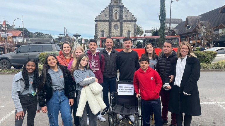 Gramado está vivenciando a 7ª edição da Semana da Pessoa com Deficiência, campanha idealizada pelo Conselho Municipal da Pessoa com Deficiência (COMPED) e que conta com o apoio da Câmara de Vereadores. Como parte da programação, nesta terça-feira (26), os Vereadores Jovens, acompanhados do diretor da Escola do Legislativo Ivo Bezzi, Fábio Schmatz, realizaram uma mobilização pelo respeito, igualdade e empatia às pessoas com deficiência.